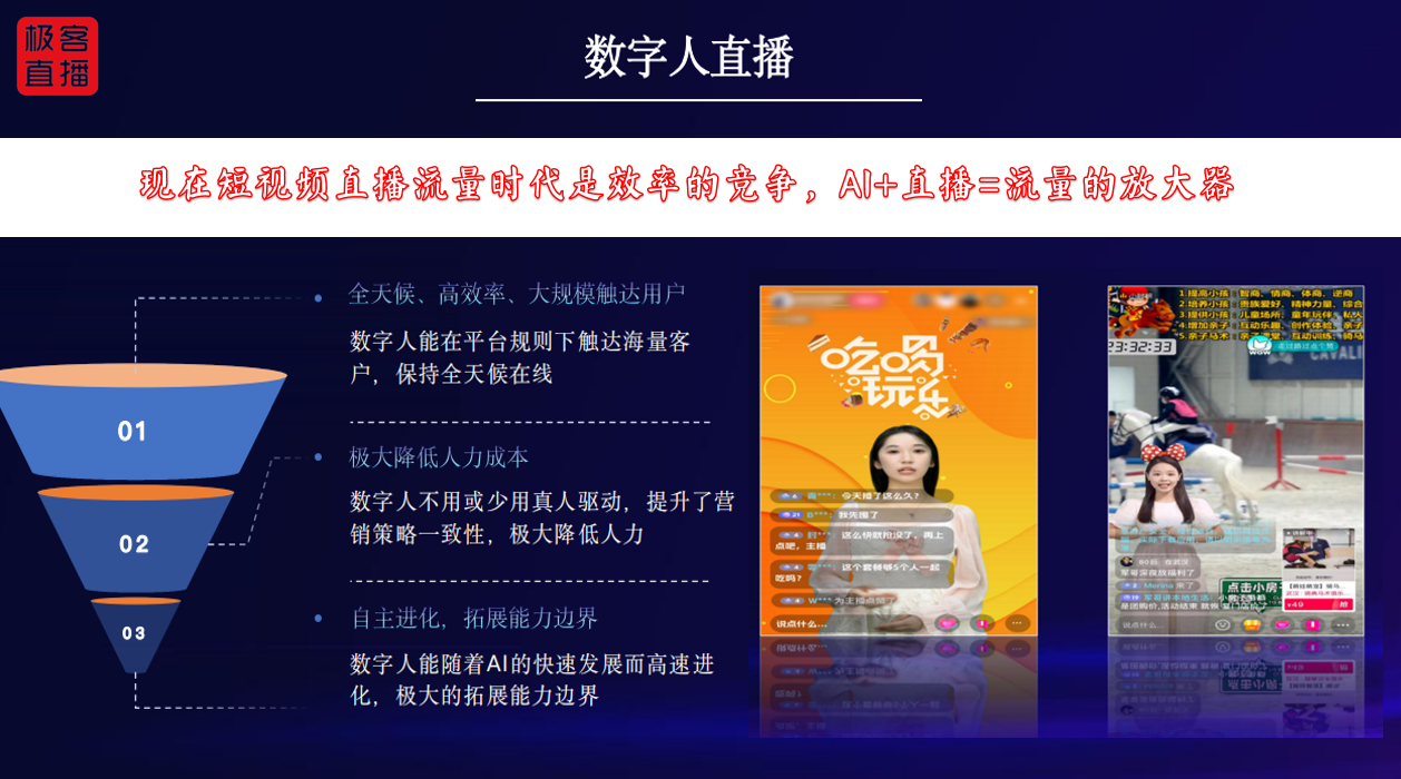 自2018年以来,短视频直播带货已经成为企业、商家、品牌商网络营销中不可缺少的工具,无论是大牌明星还是小微商家,都可以通过短视频直播带货吸引更多的消费者,提升产品的曝光度和销量。而现在企业和实体商家仍有超过90%的都还没有进入到直播这个赛道,不会播、不敢播、招不到合适的主播等等是他们的最大的痛点,极客直播为了让直播更智能,让全球直播更简单!经过三年多的潜心研发,终于在今年推出了AI数字人智能直播一体机!
